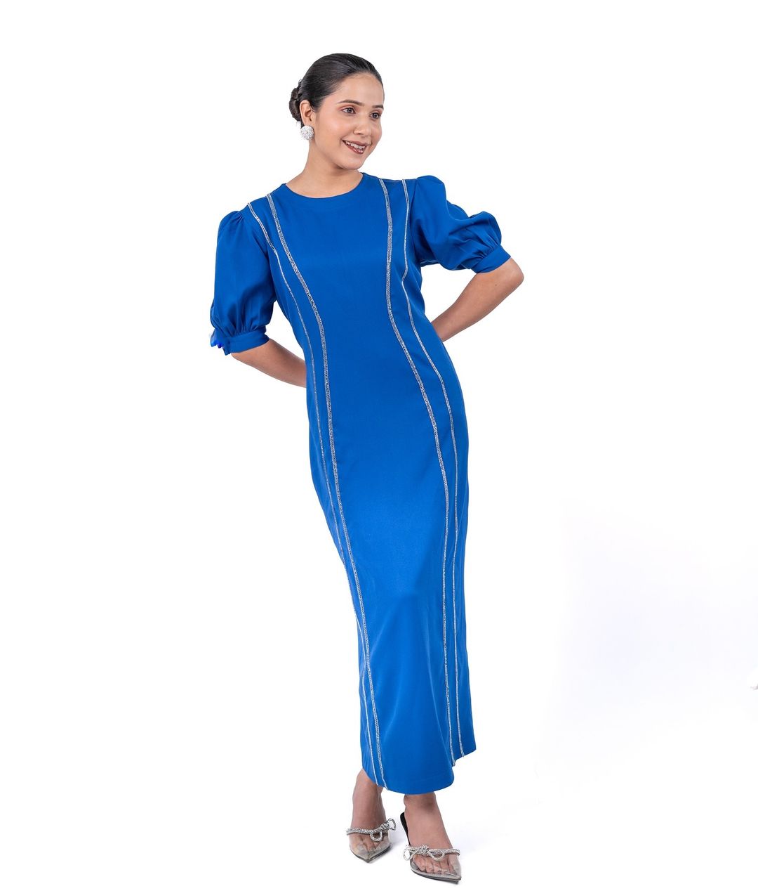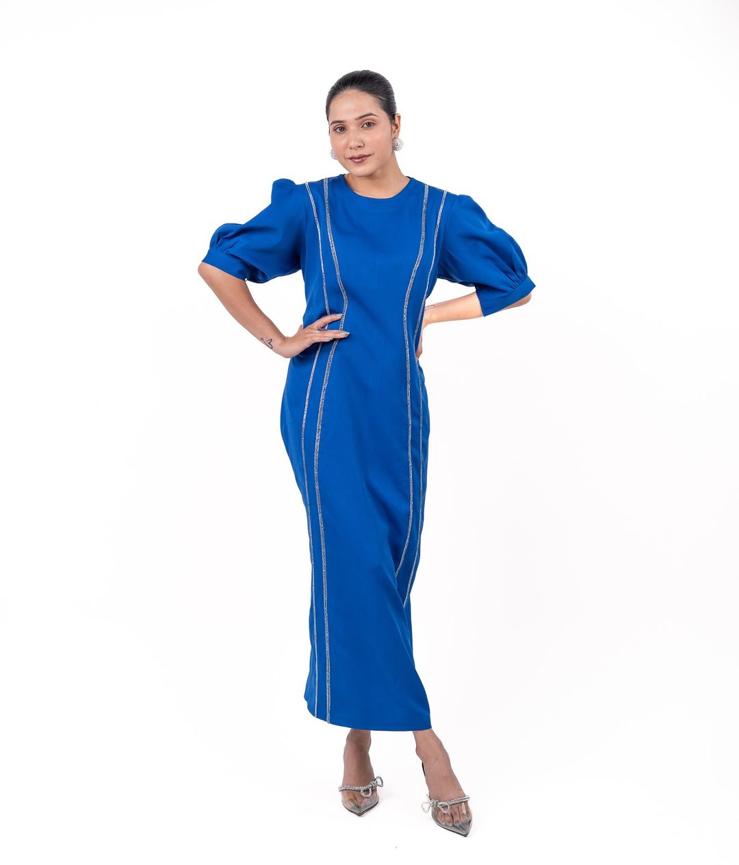 Elegant Fitted dress that cascades gracefully. Timeless silhouette for your casual to formal get togethers. Made in Deep Royal blue luxury crepe with hand embellished details