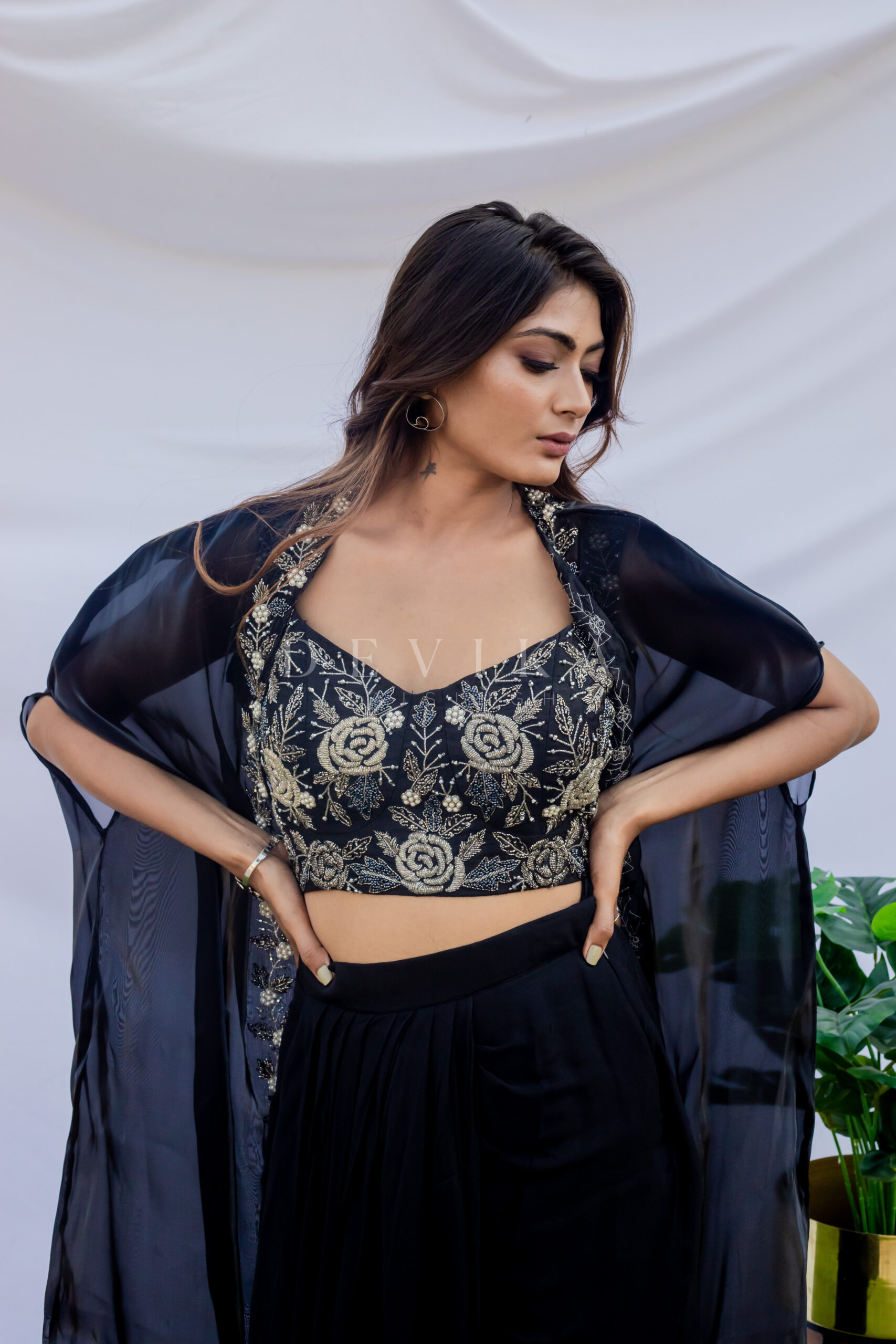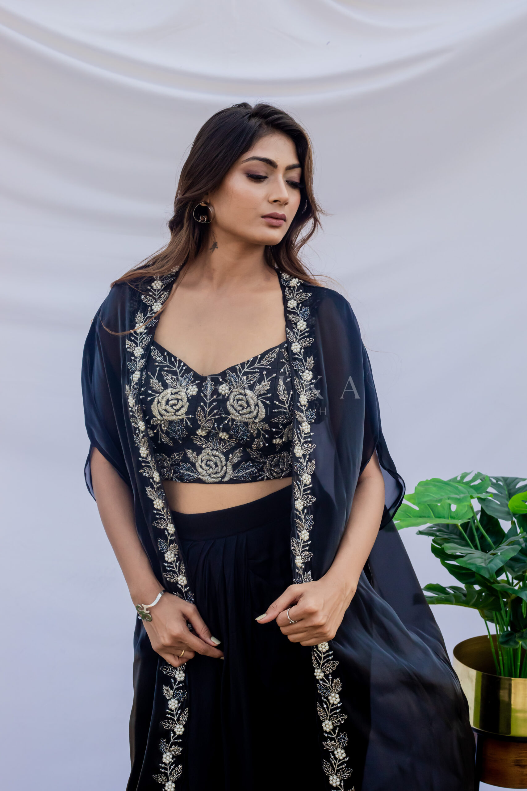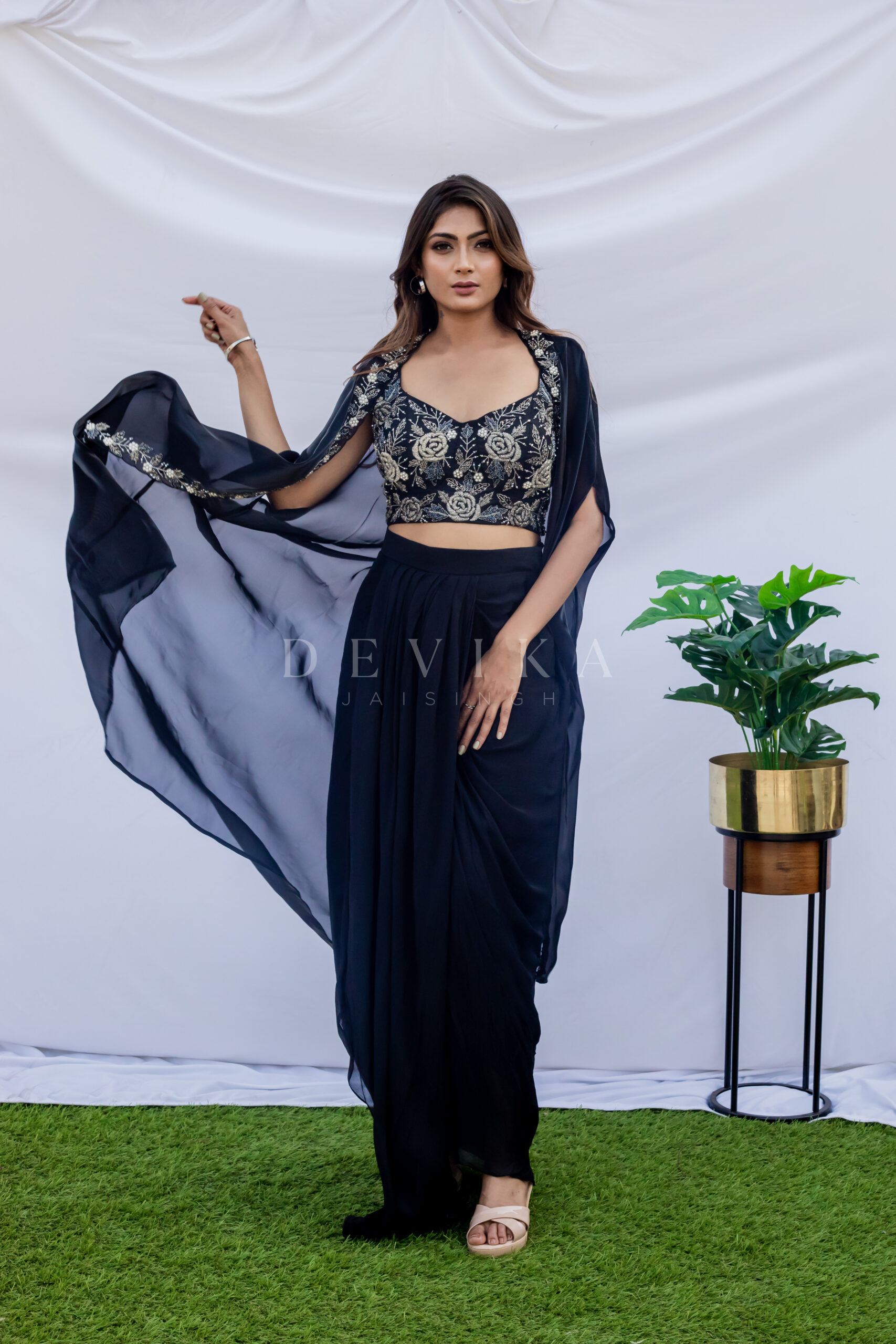 Drape skirt with embroidered bustier and cape jacket made in cobalt black .
