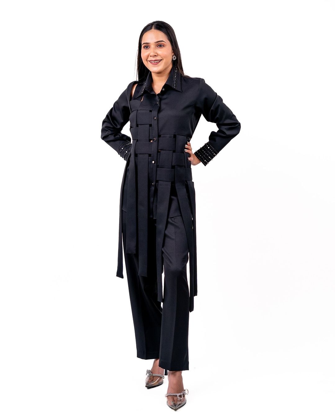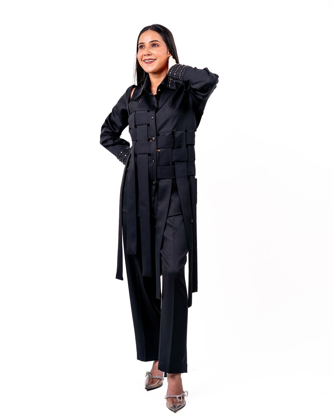 Our 2 piece chase coordinate is playful yet so chic, made in heavy crape with embellishment on collar and cuffs.