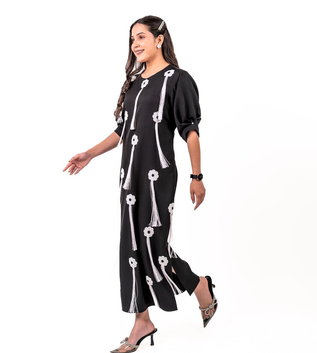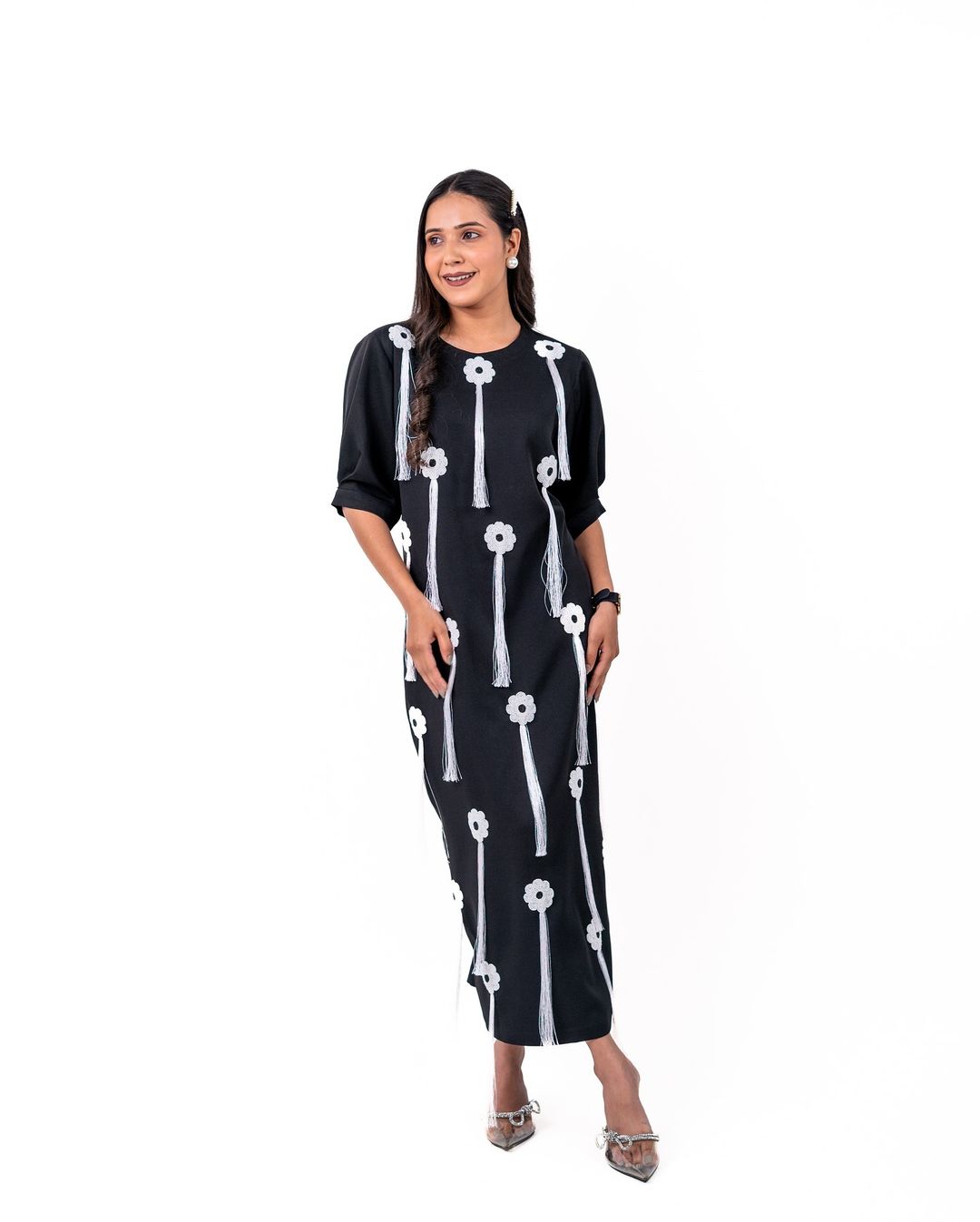 Thread hanging and white pearl flower embroidery can create a striking and elegant look This dress would be perfect for formal events, evening parties, or any occasion where you want to make a stylish statement