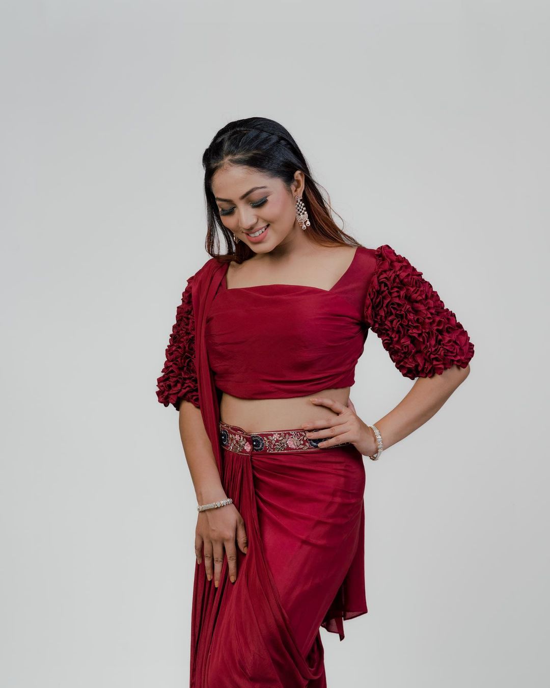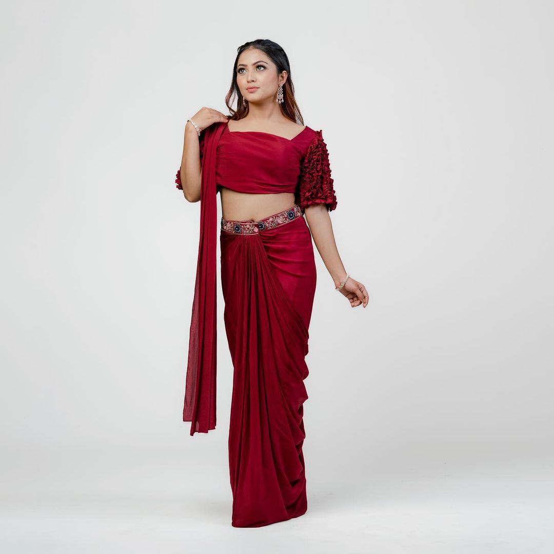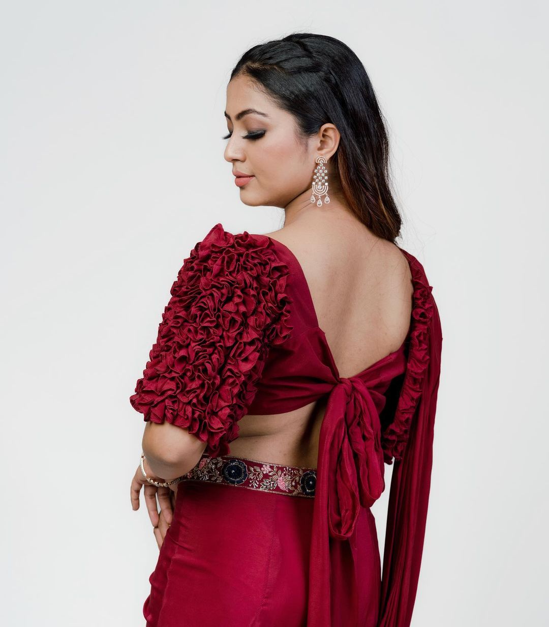 Pre-draped saree in deep maroon with a statement ruffle sleeved blouse and hand embroidered detailings on the waist.